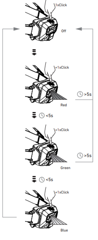 - Hoofdlamp moet uitgeschakeld zijn > Schakelaar 5 seconden ingedrukt houden > Hoofdlamp knippert 2 x > Schakelaar loslaten > Transportvergrendeling is AAN